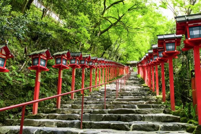 掌管水源的「水神」總本宮,擁有超過 1,300 年歷史。最著名的景點是參道兩旁排列整齊的朱紅色燈籠,四季皆美。夏季時,貴船川兩旁的「川床」料理是京都消暑首選。這裡也是「繪馬」的發源地。