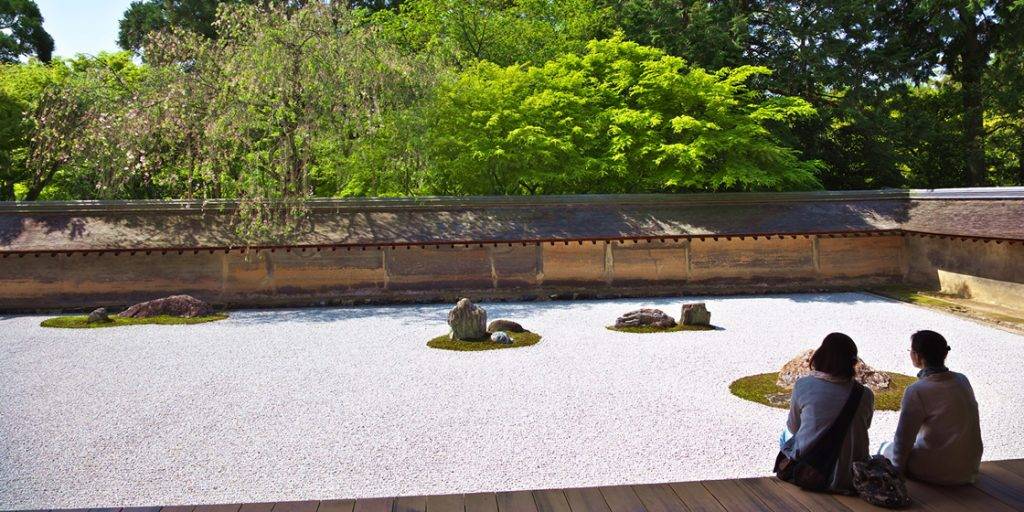 以枯山水石庭聞名全球,被聯合國教科文組織列為世界文化遺產。長方形的庭園中鋪滿白砂,並配置了 15 塊岩石。奇妙的是,不論從哪個角度觀看,都無法一次看全 15 塊岩石,蘊含深奧的禪意。