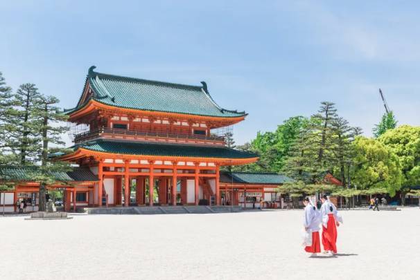 為了紀念遷都京都 1,100 週年而建,重現了平安時代的朝堂院風格。擁有日本最大的鳥居之一。內部的「神苑」庭園分為東、中、西、南四個池泉迴遊式庭園,春季的紅枝垂櫻極為著名。